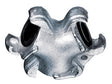 Made of malleable iron and comes with AWR4 washers and safety clip. Use of supplied safety clip guarantees the fittings are properly connected because the safety pin will not go through the holes in mating fittings until couplings are locked in place. Air King is for air and water service only.