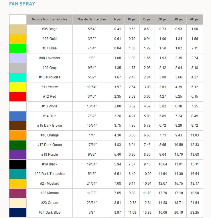 Color-coded caps for easy nozzle size identification. Nozzles are warranted to maintain their correct orifice size for five years