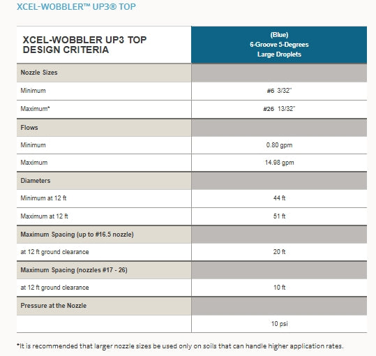 With the release of the Xcel-Wobbler™ UP3® TOP featuring the convenient UP3 nozzle, Senninger® is expanding its patented Wobbler® technology for center pivot irrigation. This innovative top-of-pipe product is designed specifically for low pressure to promote energy savings and produce a wind-resistant large droplet.