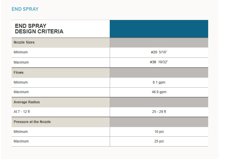 Senninger's low pressure End Spray is designed for use at the end of a machine. It can help irrigate the area between the last sprinkler and the end gun. The low angle design resists the effects of wind and the large orifice resists clogging.